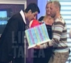 Astfel că, la încheierea filmărilor emisiunii “Confidenţial”, unde tema de dezbatere a fost “războiul sexelor”, Oana s-a repezit în culise, de unde şi-a făcut din nou apariţia în platou cu un tort pe care tronau o pereche de sâni în mărime naturală şi care, s-au dovedit a fi şi gustoşi, dacă e să-l credem pe sărbătorit.