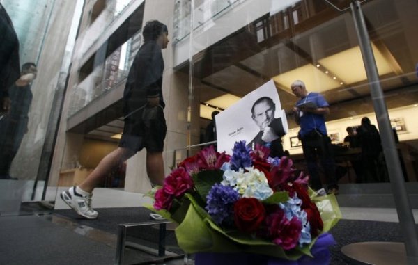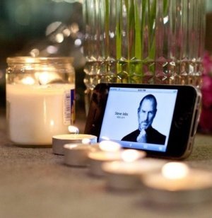 Dimineata trista pe 66 West Street, New York. Lumanari, flori şi un iPhone cu Steve Jobs amintesc de cel care a fost directorul executiv si fondatorul Apple Inc.